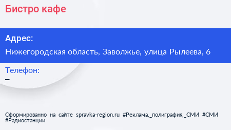 Бистро, кафе по адресу Нижегородская область, Заволжье, улица Рылеева, 6 в дальнейшем Организация, размещена в следующих категориях: