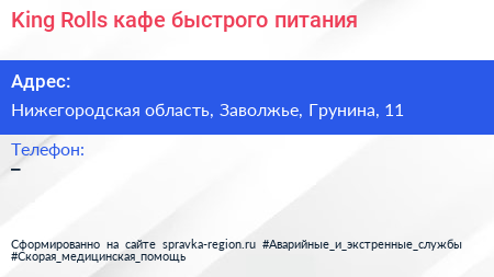 King Rolls, кафе быстрого питания по адресу Нижегородская область, Заволжье, Грунина, 11 в дальнейшем Организация, размещена в следующих категориях: