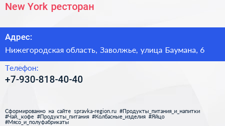 New York, ресторан по адресу Нижегородская область, Заволжье, улица Баумана, 6 в дальнейшем Организация, размещена в следующих категориях: