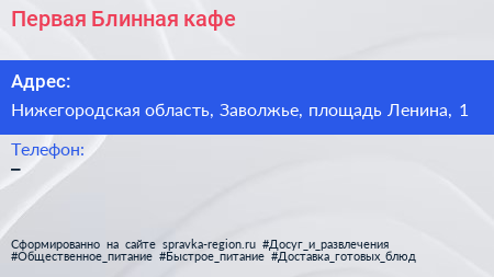 Первая Блинная, кафе по адресу Нижегородская область, Заволжье, площадь Ленина, 1 в дальнейшем Организация, размещена в следующих категориях: