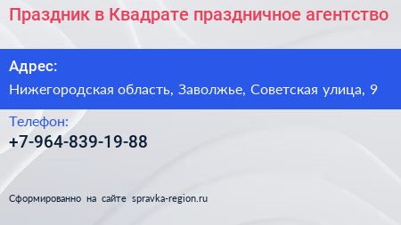 Праздник в Квадрате, праздничное агентство по адресу Нижегородская область, Заволжье, Советская улица, 9 в дальнейшем Организация, размещена в следующих категориях: