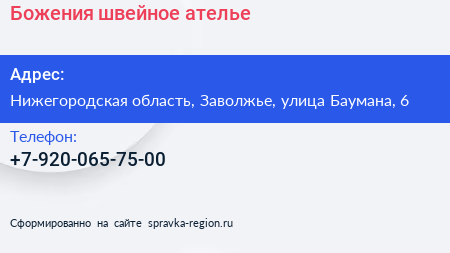 Божения, швейное ателье по адресу Нижегородская область, Заволжье, улица Баумана, 6 в дальнейшем Организация, размещена в следующих категориях: