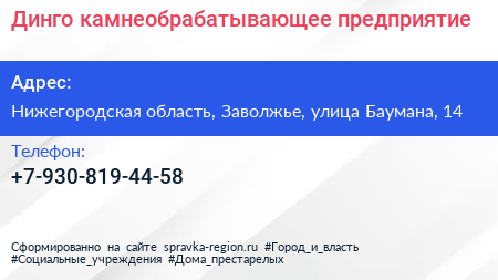 Динго, камнеобрабатывающее предприятие по адресу Нижегородская область, Заволжье, улица Баумана, 14 в дальнейшем Организация, размещена в следующих категориях: