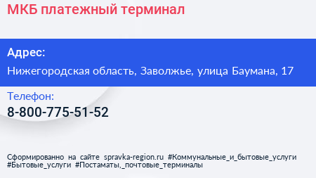 МКБ, платежный терминал по адресу Нижегородская область, Заволжье, улица Баумана, 17 в дальнейшем Организация, размещена в следующих категориях: