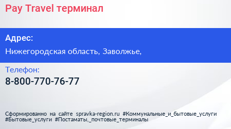 Pay.Travel, терминал по адресу Нижегородская область, Заволжье, в дальнейшем Организация, размещена в следующих категориях: