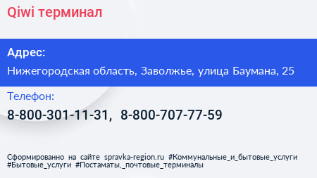 Qiwi, терминал по адресу Нижегородская область, Заволжье, улица Баумана, 25 в дальнейшем Организация, размещена в следующих категориях: