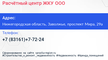 Расчётный центр ЖКУ, ООО по адресу Нижегородская область, Заволжье, проспект Мира, 29а в дальнейшем Организация, размещена в следующих категориях: