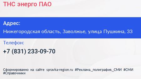 ТНС энерго, ПАО по адресу Нижегородская область, Заволжье, улица Пушкина, 33 в дальнейшем Организация, размещена в следующих категориях: