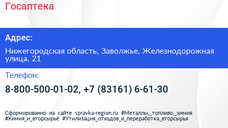 Госаптека по адресу Нижегородская область, Заволжье, Железнодорожная улица, 21 в дальнейшем Организация, размещена в следующих категориях: