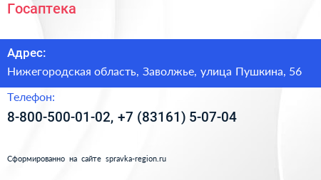 Госаптека по адресу Нижегородская область, Заволжье, улица Пушкина, 56 в дальнейшем Организация, размещена в следующих категориях: