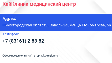 КайКлиник, медицинский центр по адресу Нижегородская область, Заволжье, улица Пономарёва, 5а в дальнейшем Организация, размещена в следующих категориях: