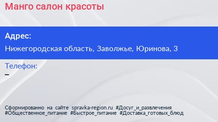 Манго, салон красоты по адресу Нижегородская область, Заволжье, Юринова, 3 в дальнейшем Организация, размещена в следующих категориях: