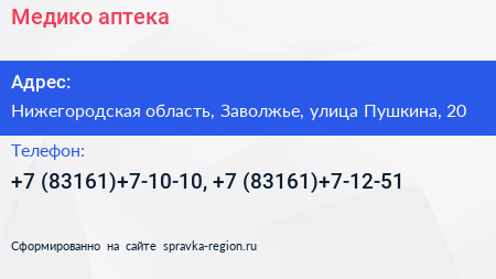 Медико, аптека по адресу Нижегородская область, Заволжье, улица Пушкина, 20 в дальнейшем Организация, размещена в следующих категориях: