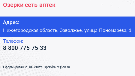 Озерки, сеть аптек по адресу Нижегородская область, Заволжье, улица Пономарёва, 1 в дальнейшем Организация, размещена в следующих категориях: