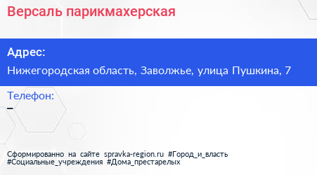 Версаль, парикмахерская по адресу Нижегородская область, Заволжье, улица Пушкина, 7 в дальнейшем Организация, размещена в следующих категориях: