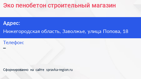 Эко-пенобетон, строительный магазин по адресу Нижегородская область, Заволжье, улица Попова, 18 в дальнейшем Организация, размещена в следующих категориях: