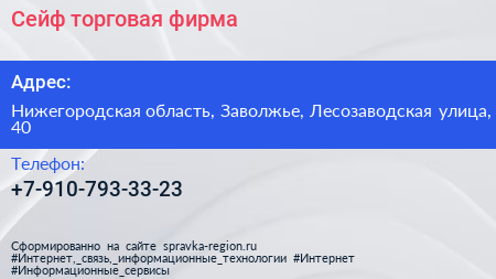 Сейф, торговая фирма по адресу Нижегородская область, Заволжье, Лесозаводская улица, 40 в дальнейшем Организация, размещена в следующих категориях: