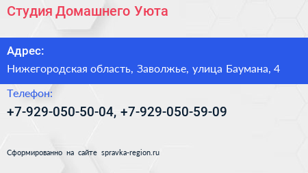 Студия Домашнего Уюта по адресу Нижегородская область, Заволжье, улица Баумана, 4 в дальнейшем Организация, размещена в следующих категориях: