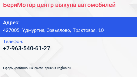 БериМотор, центр выкупа автомобилей по адресу 427005, Удмуртия, Завьялово, Трактовая, 10 в дальнейшем Организация, размещена в следующих категориях: