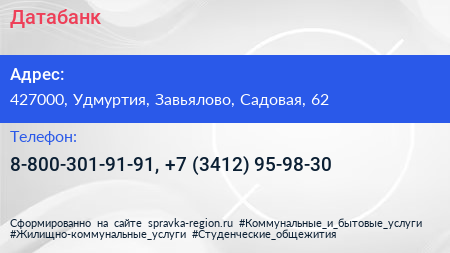 Датабанк по адресу 427000, Удмуртия, Завьялово, Садовая, 62 в дальнейшем Организация, размещена в следующих категориях: