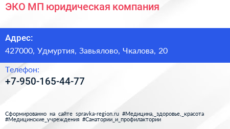 ЭКО-МП, юридическая компания по адресу 427000, Удмуртия, Завьялово, Чкалова, 20 в дальнейшем Организация, размещена в следующих категориях: