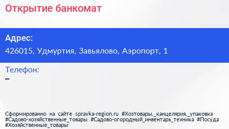 Открытие, банкомат по адресу 426015, Удмуртия, Завьялово, Аэропорт, 1 в дальнейшем Организация, размещена в следующих категориях: