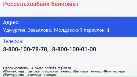 Россельхозбанк, банкомат по адресу Удмуртия, Завьялово, Молдавский переулок, 1 в дальнейшем Организация, размещена в следующих категориях: