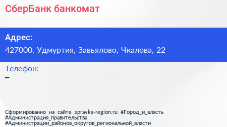 СберБанк, банкомат по адресу 427000, Удмуртия, Завьялово, Чкалова, 22 в дальнейшем Организация, размещена в следующих категориях: