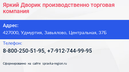 Яркий Дворик, производственно-торговая компания по адресу 427000, Удмуртия, Завьялово, Центральная, 37Б в дальнейшем Организация, размещена в следующих категориях: