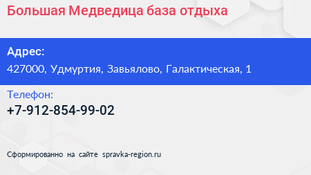 Большая Медведица, база отдыха по адресу 427000, Удмуртия, Завьялово, Галактическая, 1 в дальнейшем Организация, размещена в следующих категориях: