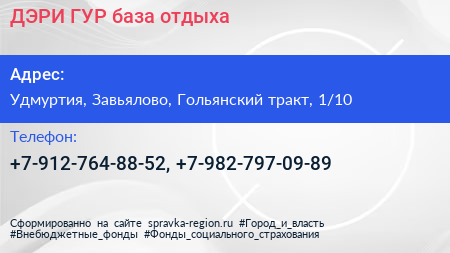 ДЭРИ ГУР, база отдыха по адресу Удмуртия, Завьялово, Гольянский тракт, 1/10 в дальнейшем Организация, размещена в следующих категориях: