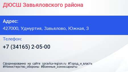 ДЮСШ Завьяловского района по адресу 427000, Удмуртия, Завьялово, Южная, 3 в дальнейшем Организация, размещена в следующих категориях: