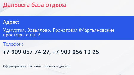 Дальвега, база отдыха по адресу Удмуртия, Завьялово, Гранатовая (Мартьяновские просторы снт), 9 в дальнейшем Организация, размещена в следующих категориях: