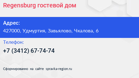 Regensburg, гостевой дом по адресу 427000, Удмуртия, Завьялово, Чкалова, 6 в дальнейшем Организация, размещена в следующих категориях: