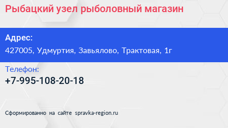 Рыбацкий узел, рыболовный магазин по адресу 427005, Удмуртия, Завьялово, Трактовая, 1г в дальнейшем Организация, размещена в следующих категориях: