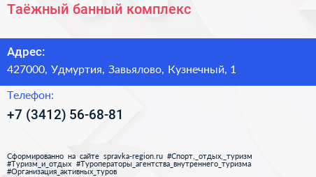 Таёжный, банный комплекс по адресу 427000, Удмуртия, Завьялово, Кузнечный, 1 в дальнейшем Организация, размещена в следующих категориях: