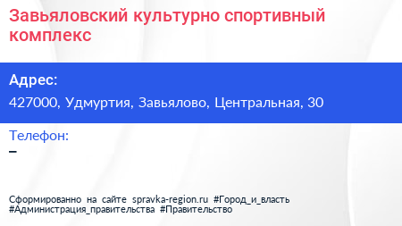 Завьяловский, культурно-спортивный комплекс по адресу 427000, Удмуртия, Завьялово, Центральная, 30 в дальнейшем Организация, размещена в следующих категориях: