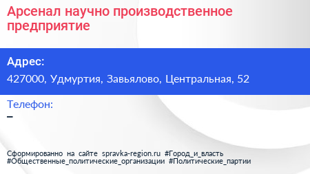 Арсенал, научно-производственное предприятие по адресу 427000, Удмуртия, Завьялово, Центральная, 52 в дальнейшем Организация, размещена в следующих категориях: