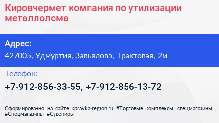 Кировчермет, компания по утилизации металлолома по адресу 427005, Удмуртия, Завьялово, Трактовая, 2м в дальнейшем Организация, размещена в следующих категориях:
