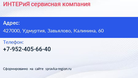 ИНТЕРиЯ, сервисная компания по адресу 427000, Удмуртия, Завьялово, Калинина, 60 в дальнейшем Организация, размещена в следующих категориях: