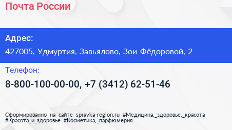 Почта России по адресу 427005, Удмуртия, Завьялово, Зои Фёдоровой, 2 в дальнейшем Организация, размещена в следующих категориях:
