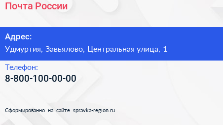 Почта России по адресу Удмуртия, Завьялово, Центральная улица, 1 в дальнейшем Организация, размещена в следующих категориях: