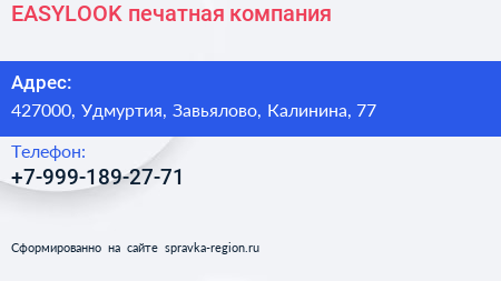 EASYLOOK, печатная компания по адресу 427000, Удмуртия, Завьялово, Калинина, 77 в дальнейшем Организация, размещена в следующих категориях: