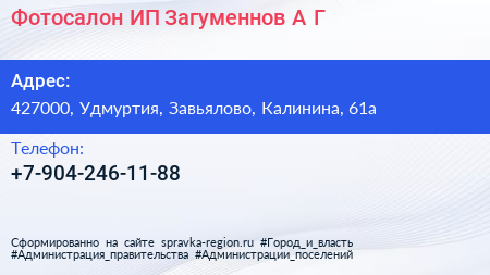 Фотосалон, ИП Загуменнов А.Г. по адресу 427000, Удмуртия, Завьялово, Калинина, 61а в дальнейшем Организация, размещена в следующих категориях: