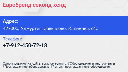 Евробренд, секонд-хенд по адресу 427000, Удмуртия, Завьялово, Калинина, 61а в дальнейшем Организация, размещена в следующих категориях: