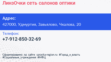 ЛинзОчки, сеть салонов оптики по адресу 427000, Удмуртия, Завьялово, Чкалова, 20 в дальнейшем Организация, размещена в следующих категориях: