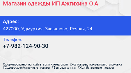 Магазин одежды, ИП Ажгихина О.А. по адресу 427000, Удмуртия, Завьялово, Речная, 24 в дальнейшем Организация, размещена в следующих категориях: