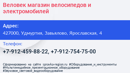 Веловек, магазин велосипедов и электромобилей по адресу 427000, Удмуртия, Завьялово, Ярославская, 4 в дальнейшем Организация, размещена в следующих категориях: