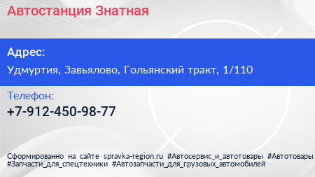 Автостанция Знатная по адресу Удмуртия, Завьялово, Гольянский тракт, 1/110 в дальнейшем Организация, размещена в следующих категориях: