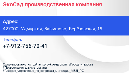 ЭкоСад, производственная компания по адресу 427000, Удмуртия, Завьялово, Берёзовская, 19 в дальнейшем Организация, размещена в следующих категориях: